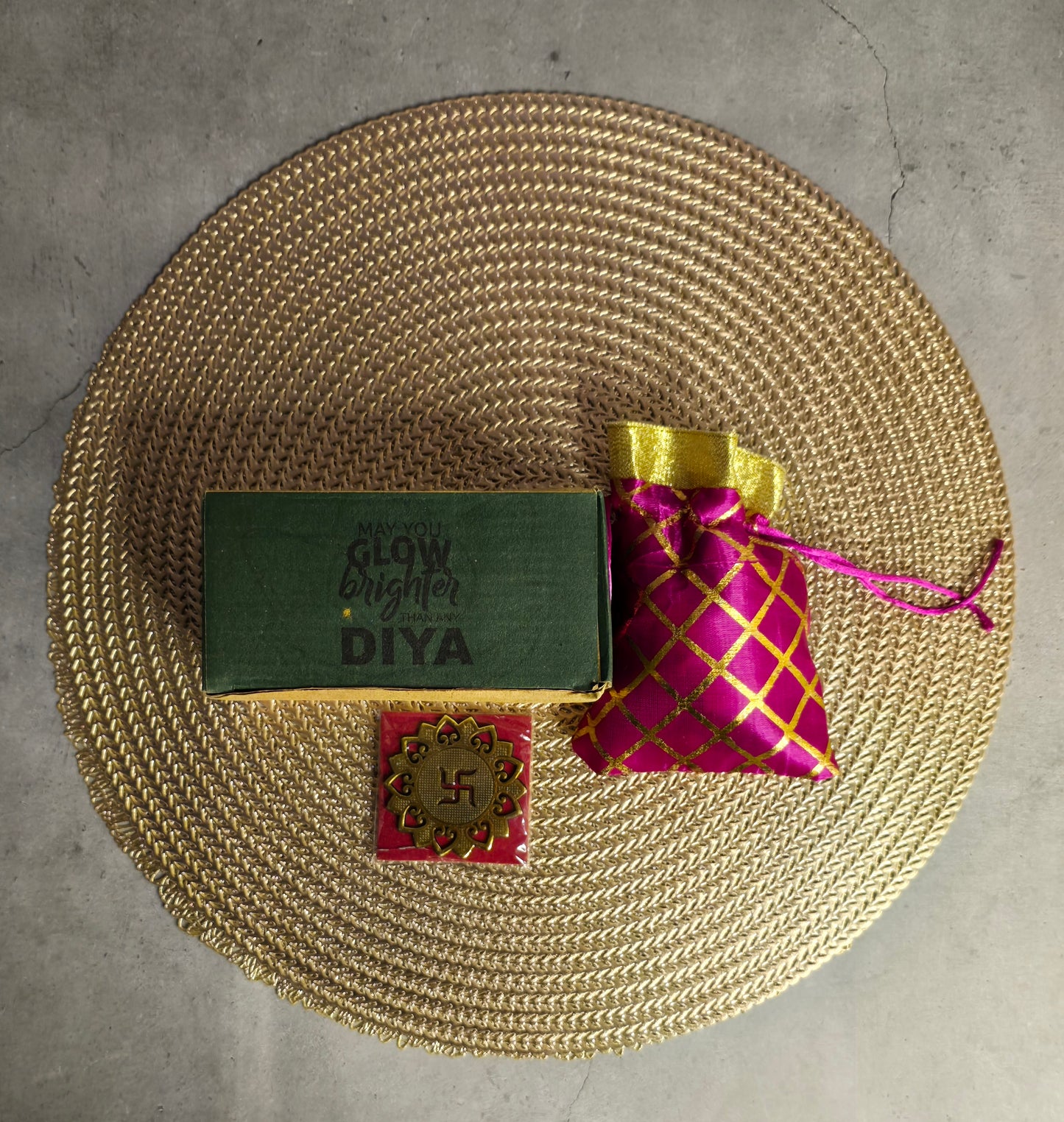 Gift Box with Diya: A green box labeled "May You Glow Brighter – 3D Glow Light Diyas (12 pcs)," l perfect for lighting up homes during the festival.